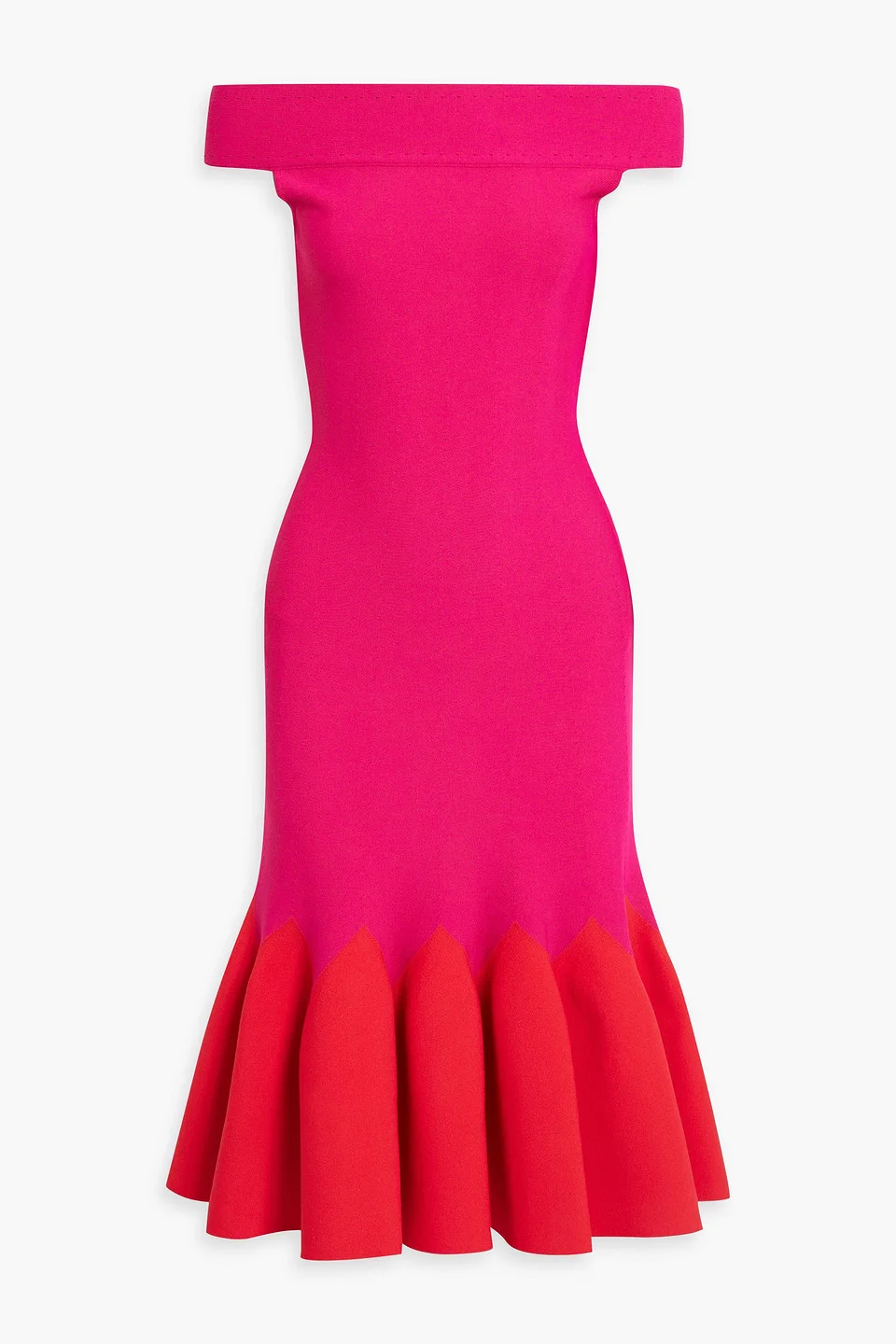 Off-the-shoulder two-tone pointelle-knit midi dress