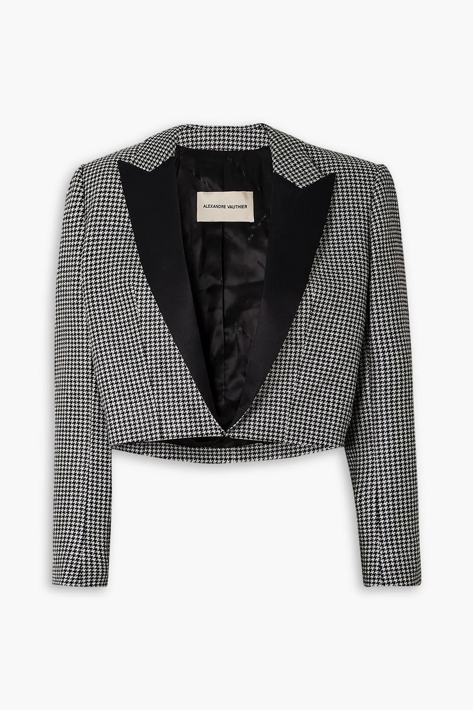 Cropped satin-trimmed metallic houndstooth wool-blend blazer
