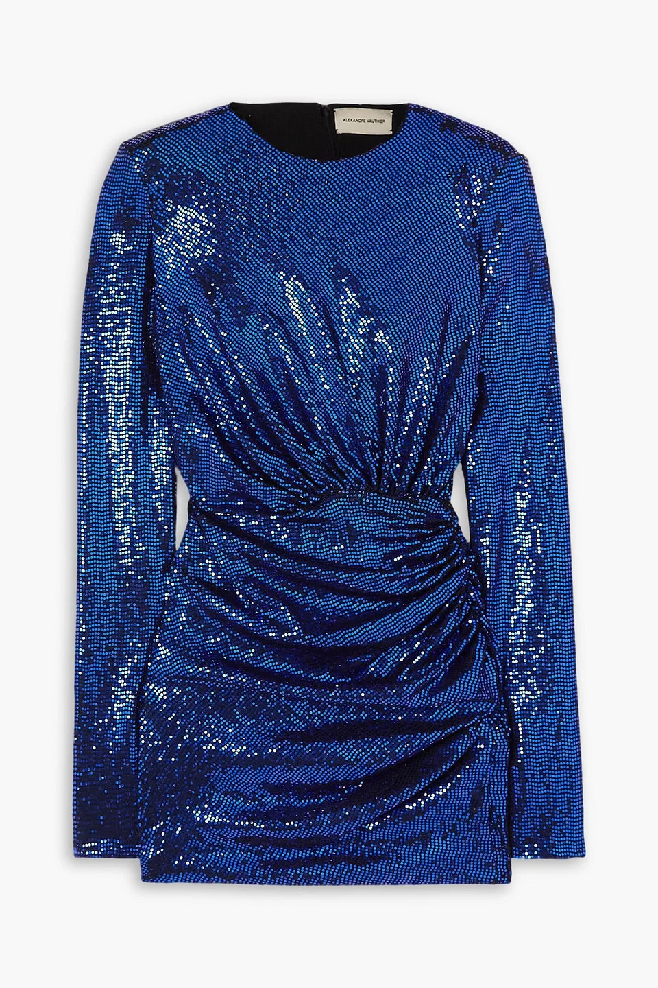 Dress stretch-satin sequins shoulder pads ruched concealed zip fastening along back fully lined mid-weight, stretchy fabric dry clean imported Alexandre Vauthier's glamorous mini dress is designed to sparkle from every angle. Made from draped and ruched stretch-satin, it's covered with 'Majestic Blue' sequins and has the designer's signature padded shoulders. 87% Polyamide 8% Polyester 5% Elastane Product Code 1647597345659241