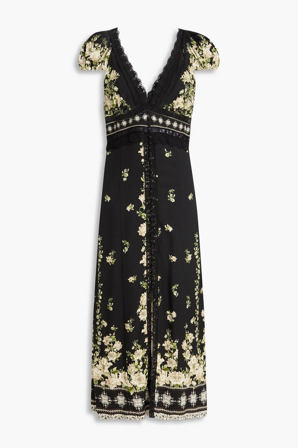 Dress floral-print crepe button-embellished lace trims shirred elasticated cuffs front slit concealed hook and zip fastening at back partially lined mid-weight, non-stretchy fabric dry clean imported 100% Polyester Product Code 46376663163092702