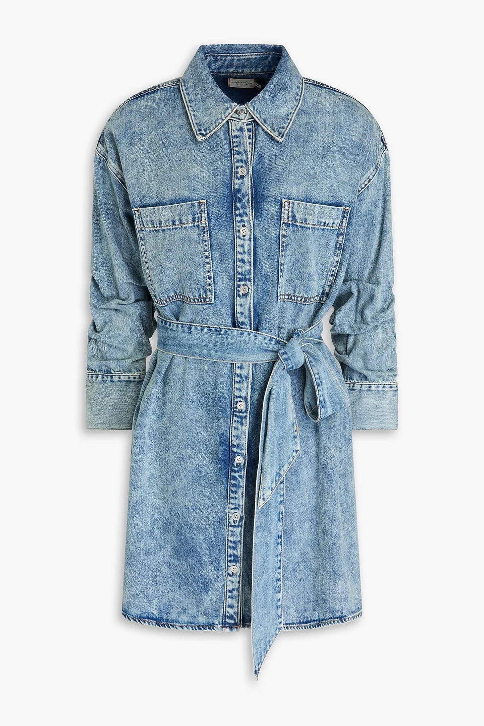 Shirt dress acid-wash denim detachable waist tie gathered sleeves buttoned cuffs breast pockets button fastenings through front mid-weight, slightly stretchy fabric dry clean imported Get ready to turn heads in Alice + Olivia’s ‘Brigita’ mini shirt dress. Made from denim with a light acid-wash finish, it has a detachable waist tie and gathered sleeves. Wear it with your favorite boots for a casual brunch or dress it up with heels for a night out. 86% Cotton 14% Lyocell Product Code 46376663162872642