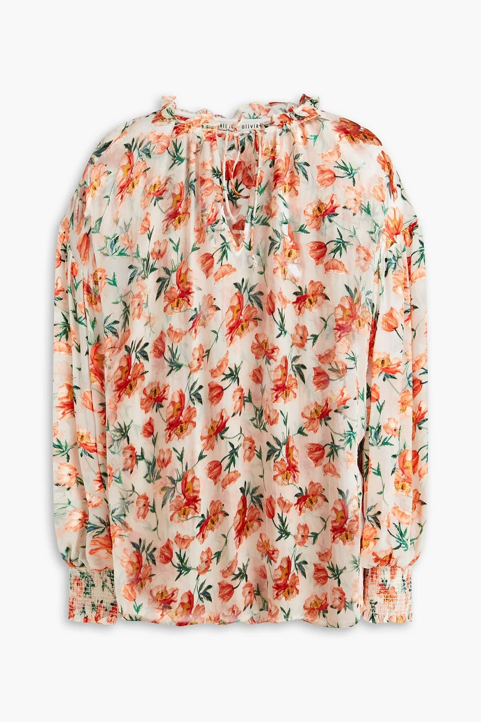 Blouse floral-design devore satin ruffled trims gathered sleeves side slits tie-fastening keyhole at front lightweight, non-stretchy fabric dry clean imported Get ready to turn heads with Alice + Olivia’s ‘Julius’ blouse. Made from a lightweight satin, it showcases a stunning floral design with ruffled trims and gathered sleeves. Just add tailored pants and heels for a chic outing. 56% Viscose 44% Silk Product Code 1647597353113571