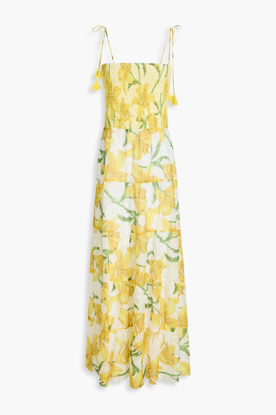 Marna tiered smocked floral-print broderie anglaise midi dress