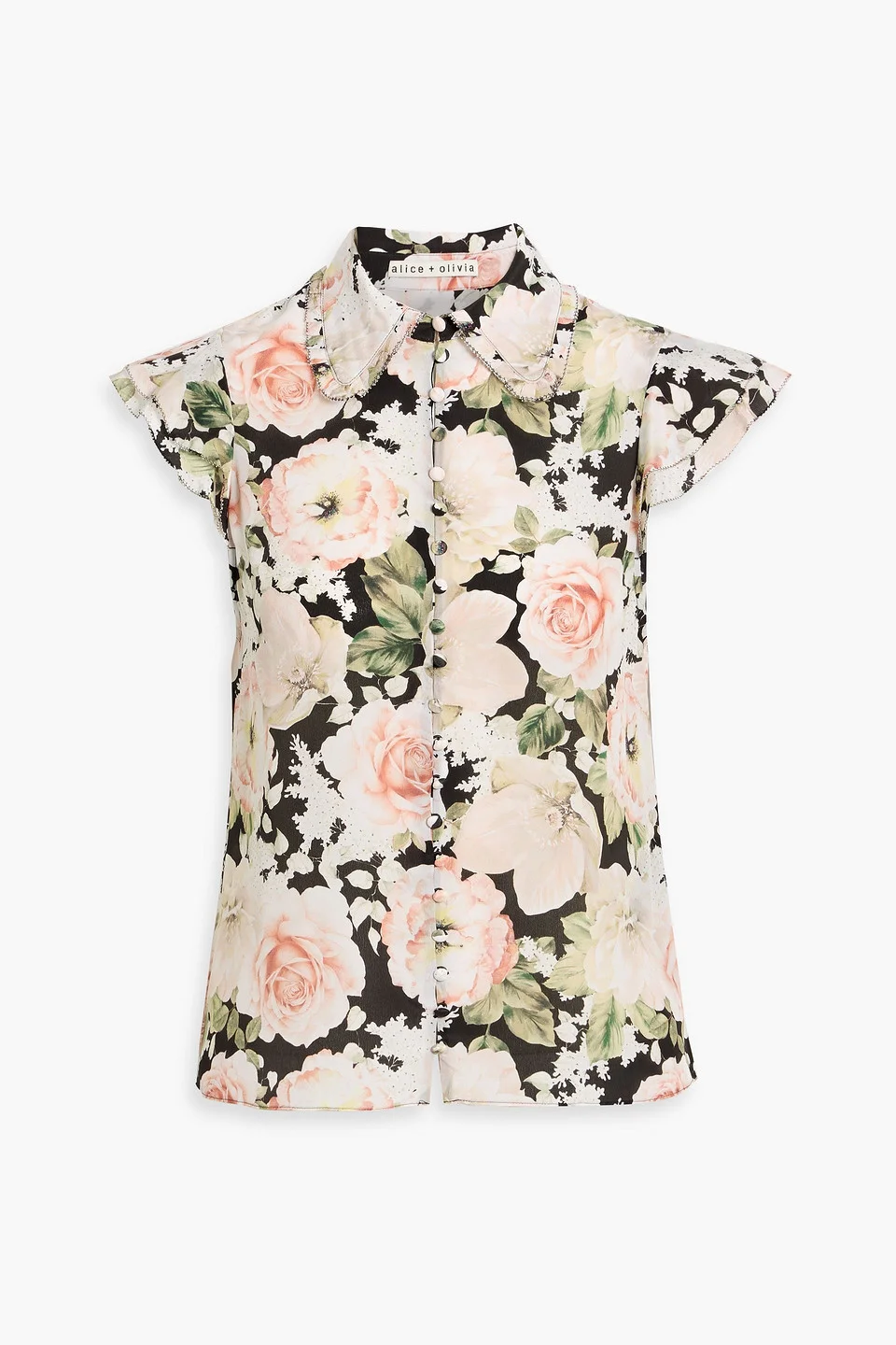 Blouse floral-print silk crepe de chine picot trims ruffled sleeves button fastenings through front lightweight, non-stretchy fabric dry clean imported 100% Silk Product Code 46376663162995959