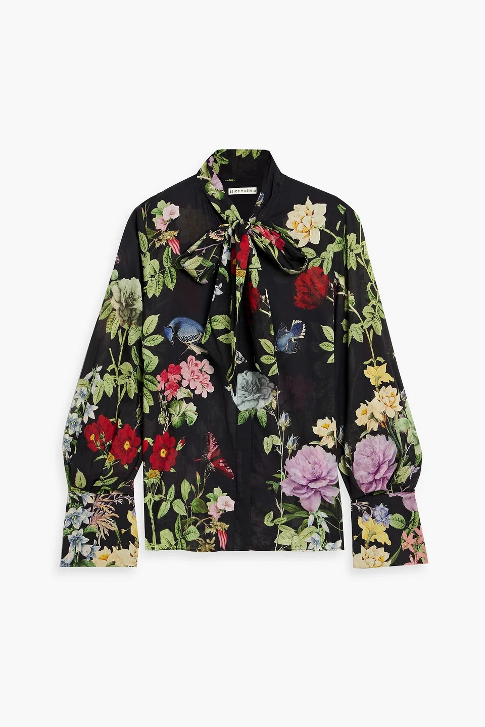 Top floral-design cotton pussy-bow buttoned cuffs concealed button fastenings through front mid-weight, non-stretchy fabric dry clean imported 100% Cotton Product Code 46376663163075371