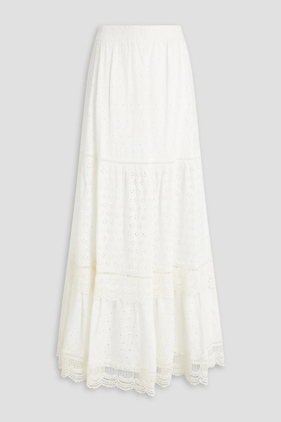 Skirt broderie anglaise cotton tiered smocked guipure lace trims lattice trims elasticated waist partially lined hook and zip fastening at back mid-weight, non-stretchy fabric dry clean imported Looking for a really great addition to your summer wardrobe? Alice + Olivia's 'Reise' maxi skirt is made from soft cotton with beautiful broderie anglaise detailing and tiers. Just add a tucked-in top and mules for a chic day out. 100% Cotton Product Code 1647597353112730