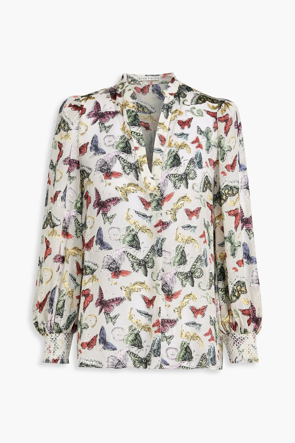 Blouse printed fil coupe chiffon shirred cuffs slips on lightweight, non-stretchy fabric dry clean imported 63% Viscose 37% Silk 0% Polyester Product Code 46376663163092567