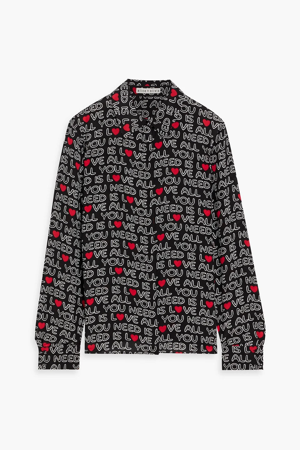 Shirt printed silk crepe de chine buttoned cuffs partially concealed button fastenings through front lightweight, non-stretchy fabric dry clean imported There’s so much to love (literally) about Alice + Olivia's 'Willa' shirt. Made from silk crepe de chine, it's printed with an inspirational lyric by The Beatles. Wear it with anything from your favorite jeans to a sleek mini skirt and heels. 100% Silk Product Code 46376663162926012
