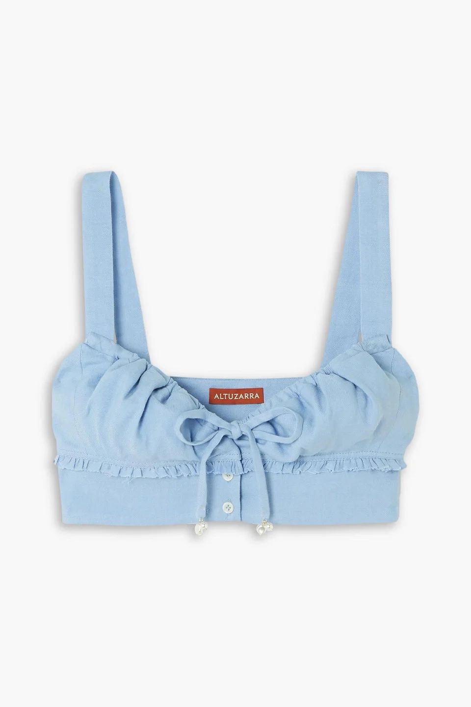 Top faux pearl linen-blend ruffled trims cropped tie-fastening keyhole at front button fastenings through front partially lined non-stretchy fabric mid-weight fabric dry clean made in italy 66% Linen 31% Viscose 3% Elastane Product Code 1647597322447421