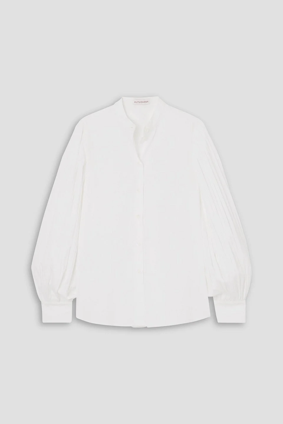 Shirt cotton-blend poplin pintucked pleated back buttoned cuffs curved hem button fastenings through front mid-weight, non-stretchy fabric dry clean made in italy Want to look pretty and polished? The pintucked sleeves of Altuzarra's 'Patsy' shirt adds flirty detail to the everyday crisp cotton-blend poplin shirt. 70% Cotton 30% Polyester Product Code 46376663162956958