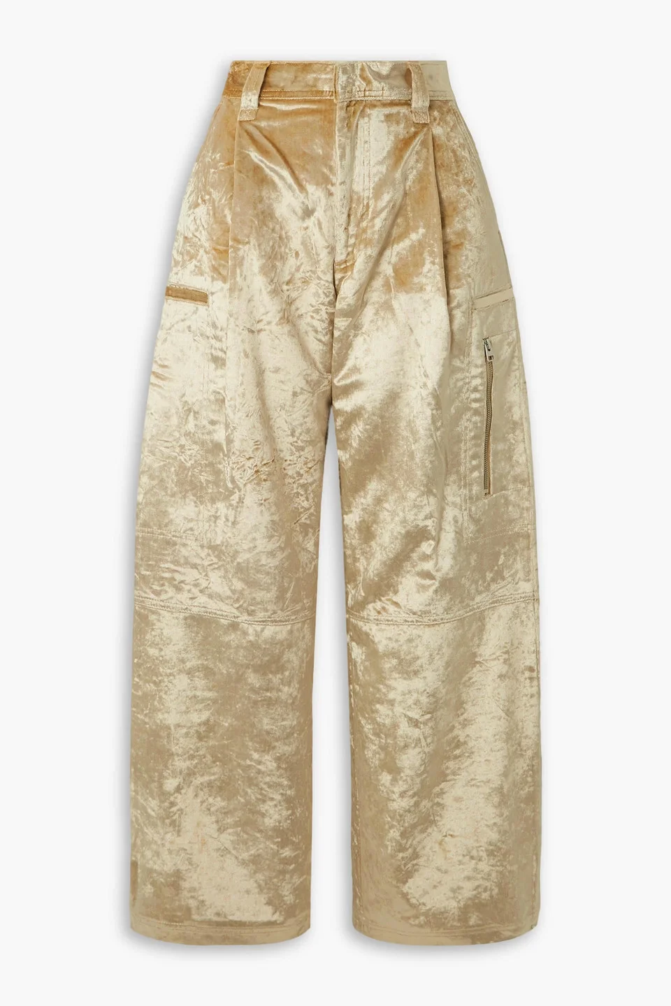 Cargo pants crushed-velvet multipockets belt loops high-rise cut snap-fastening cuffs concealed hook, button and zip fastening at front lightweight, non-stretchy fabric dry clean imported AMI PARIS' collections draw inspiration from the nonchalance of its native city. These cargo pants are made from plush crushed-velvet and fall to wide legs. Half-tuck a T-shirt into the low-slung waist. 61% Viscose 27% Cotton 12% Polyester Product Code 1647597346907430