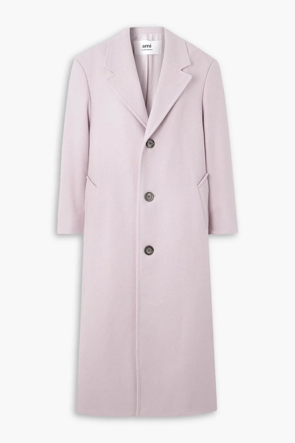 Coat twill wool-blend buttoned cuffs two front slant pockets back vent fully lined button fastenings through front weighted, non-stretchy fabric dry clean imported A versatile styling piece, this AMI PARIS coat is made from baby-pink wool-blend twill and has a boxy, longline shape with notched lapels and wide shoulders. 90% Virgin Wool 10% Polyamide Product Code 1647597352277974