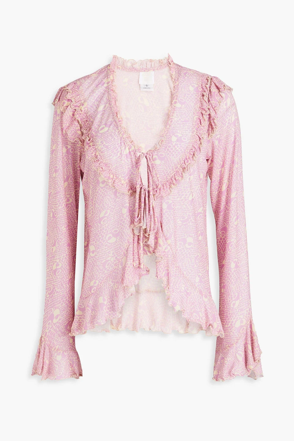 Top printed mesh ruffled elongated sleeves slit cuffs ties at front stretchy fabric mid-weight fabric dry clean 100% Polyester Product Code 1647597320878878