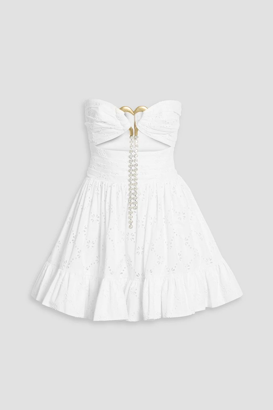 Strapless dress broderie anglaise cotton embellished crystals cutout pintucked ruffled hem zip fastening along back internal gumming fully lined mid-weight, non-stretchy fabric dry clean imported 100% Cotton Product Code 46376663163076542