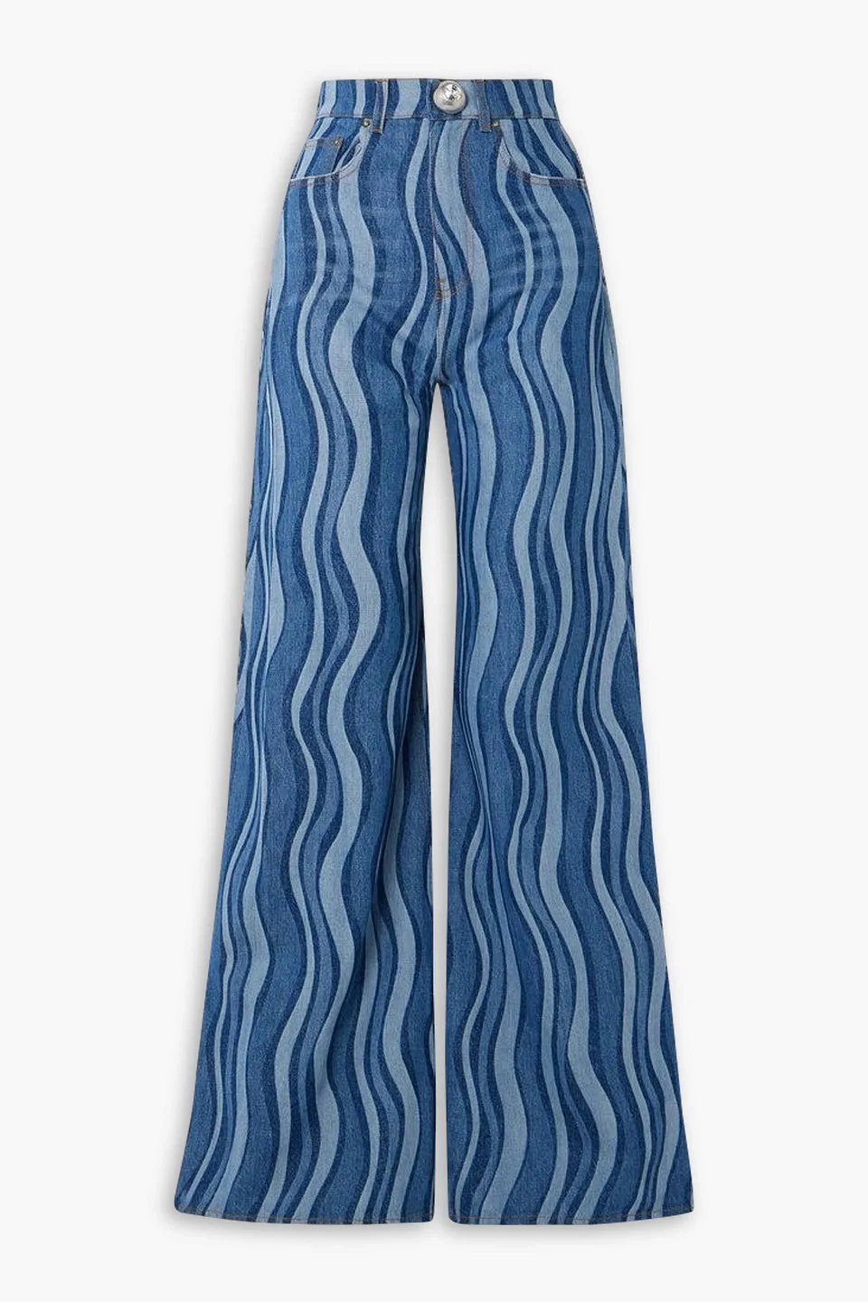 Wide-leg jeans printed denim crystals waist tabs high-rise cut five pockets snap and concealed zip fastening at front mid-weight, non-stretchy fabric machine wash made in italy The duo behind New York label AREA shares a penchant for the '80s; a passion that explains the disco-inspired print mapping these 'Sunray' jeans. They're cut to a high-rise wide-leg profile from rigid denim that promises to hold its shape, and finished with an oversized button-fastening crowned with a glinting crystal. Think of them as sartorial serotonin. 100% Cotton Product Code 1647597353763694