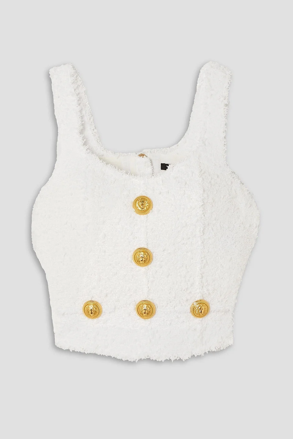 Bustier top boucle-tweed button-embellished faux pockets zip fastening through back internal boning non-stretchy fabric mid-weight fabric dry clean imported 100% Polyamide Product Code 38063312419801569