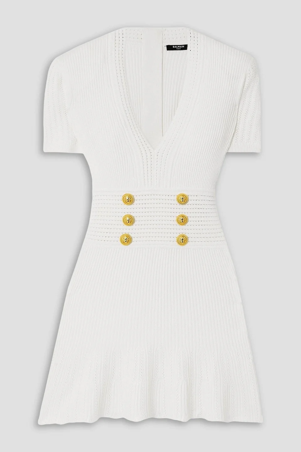 Dress knitted button-embellished pointelle trims shoulder pads zip fastening along back mid-weight knit dry clean made in italy 82% Viscose 16% Polyester 2% Polyamide Product Code 1647597336772917