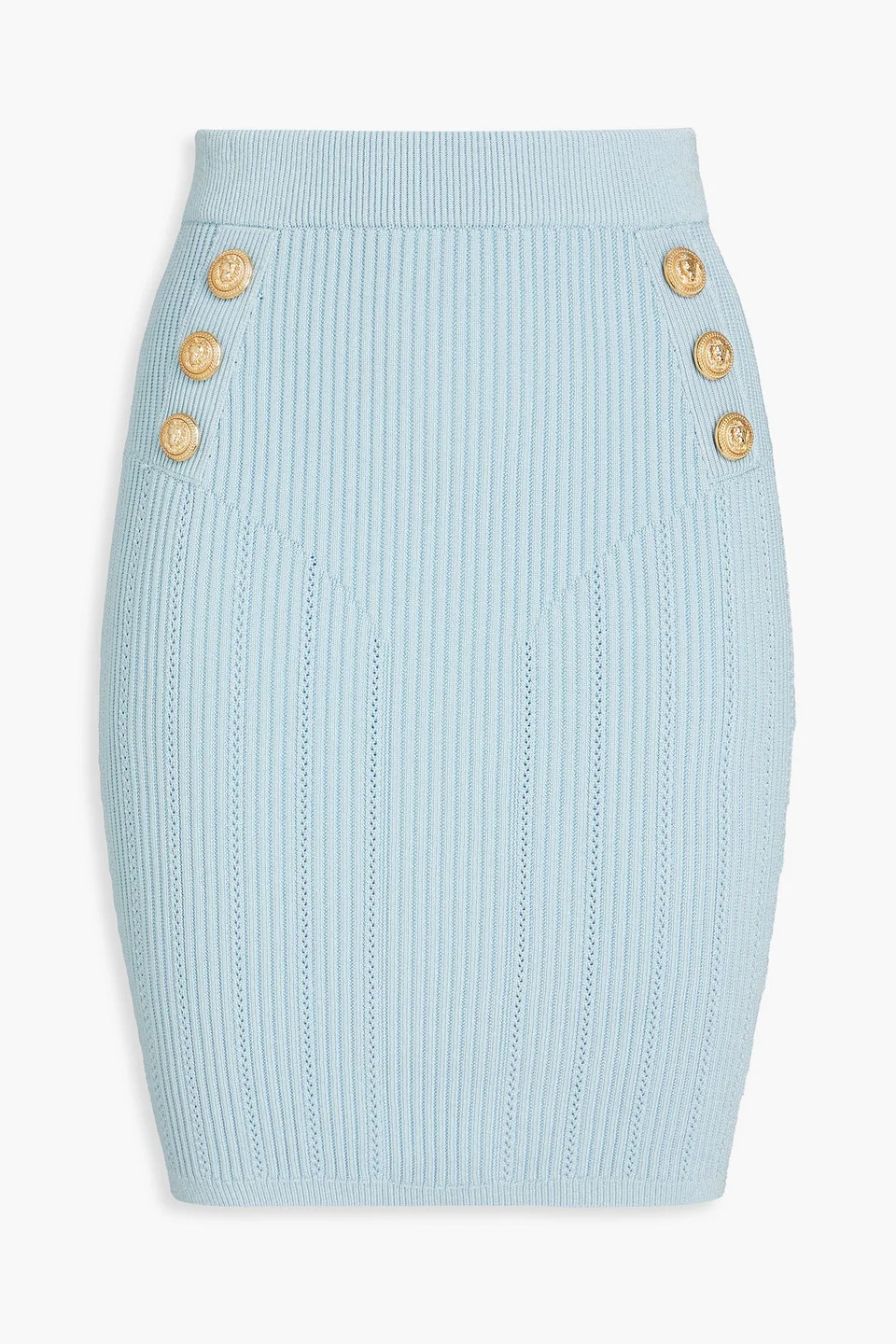 Skirt ribbed-knit button-embellished pointelle trims elasticated waist slips on mid-weight knit dry clean made in italy Balmain's ribbed-knit mini skirt is a great pop of color for any look. The button-embellishments add a playful touch. Wear with everything from a blazer to a cropped top. 83% Viscose 17% Polyamide Product Code 1647597357006562