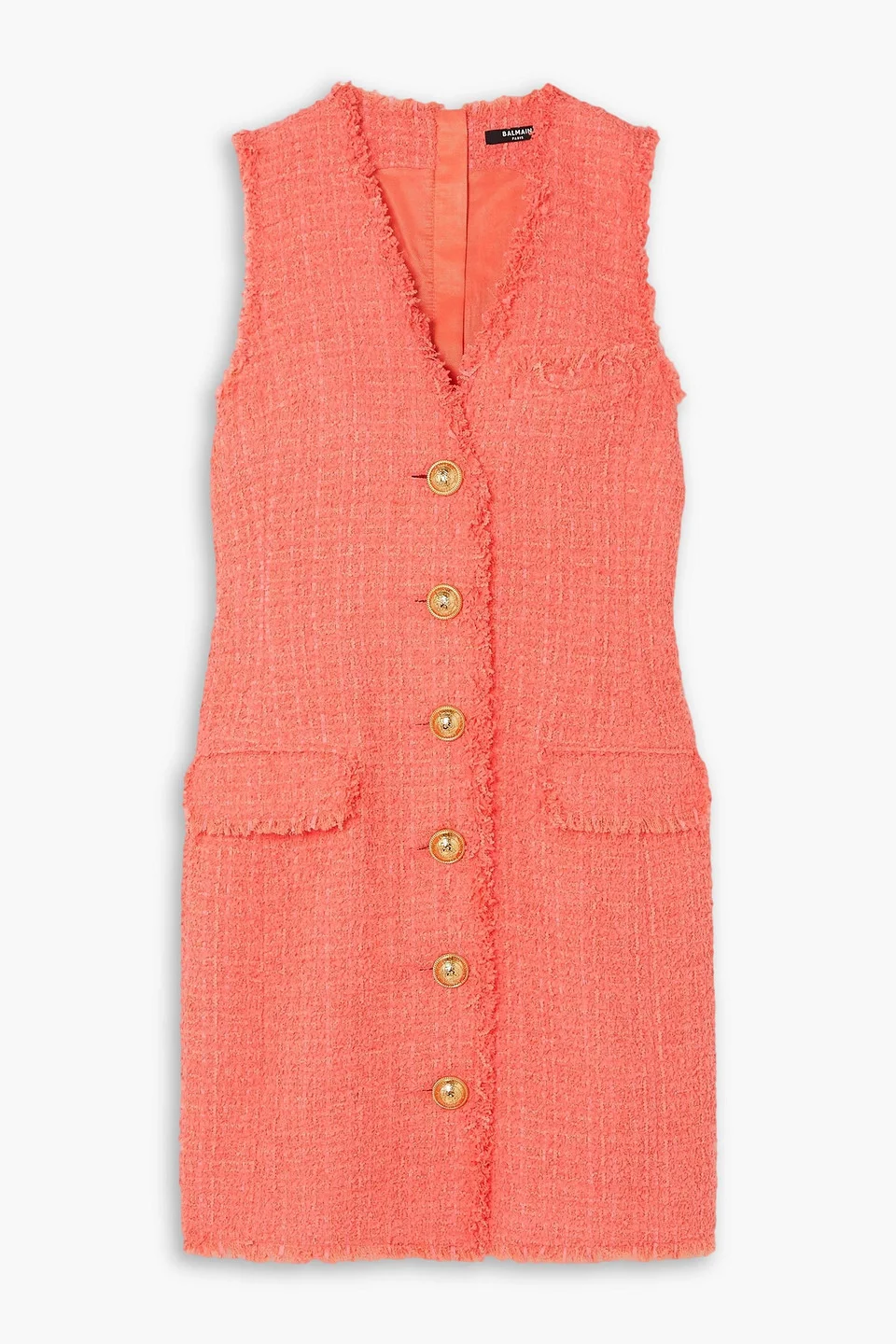 Dress tweed frayed button-detailed two front flap pockets breast pocket button fastenings through front zip fastening along back fully lined mid-weight, non-stretchy fabric dry clean imported Balmain's mini dress is made from coral tweed that's frayed along the edges for a tactile finish and slightly undone feel. Designed for a slim fit, it has flap pockets and polished gold-tone buttons etched with the label's signature lion head. Wear yours with platform sandals or point-toe flats. 79% Polyamide 15% Virgin Wool 6% Cotton Product Code 1647597306813507