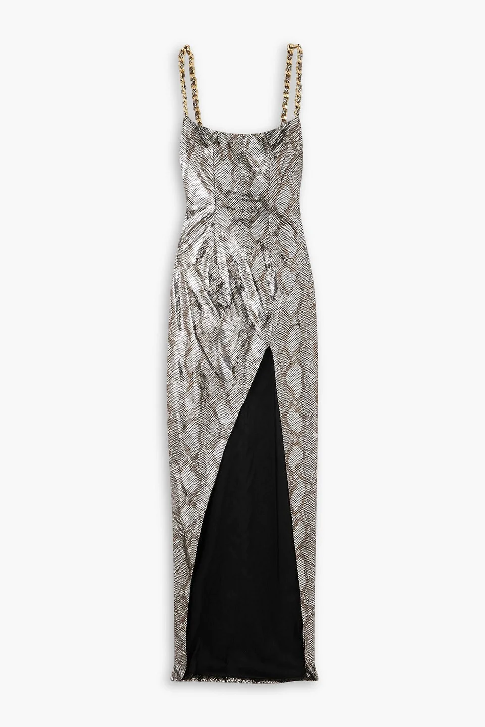 Chain-embellished snake-print metallic coated maxi dress