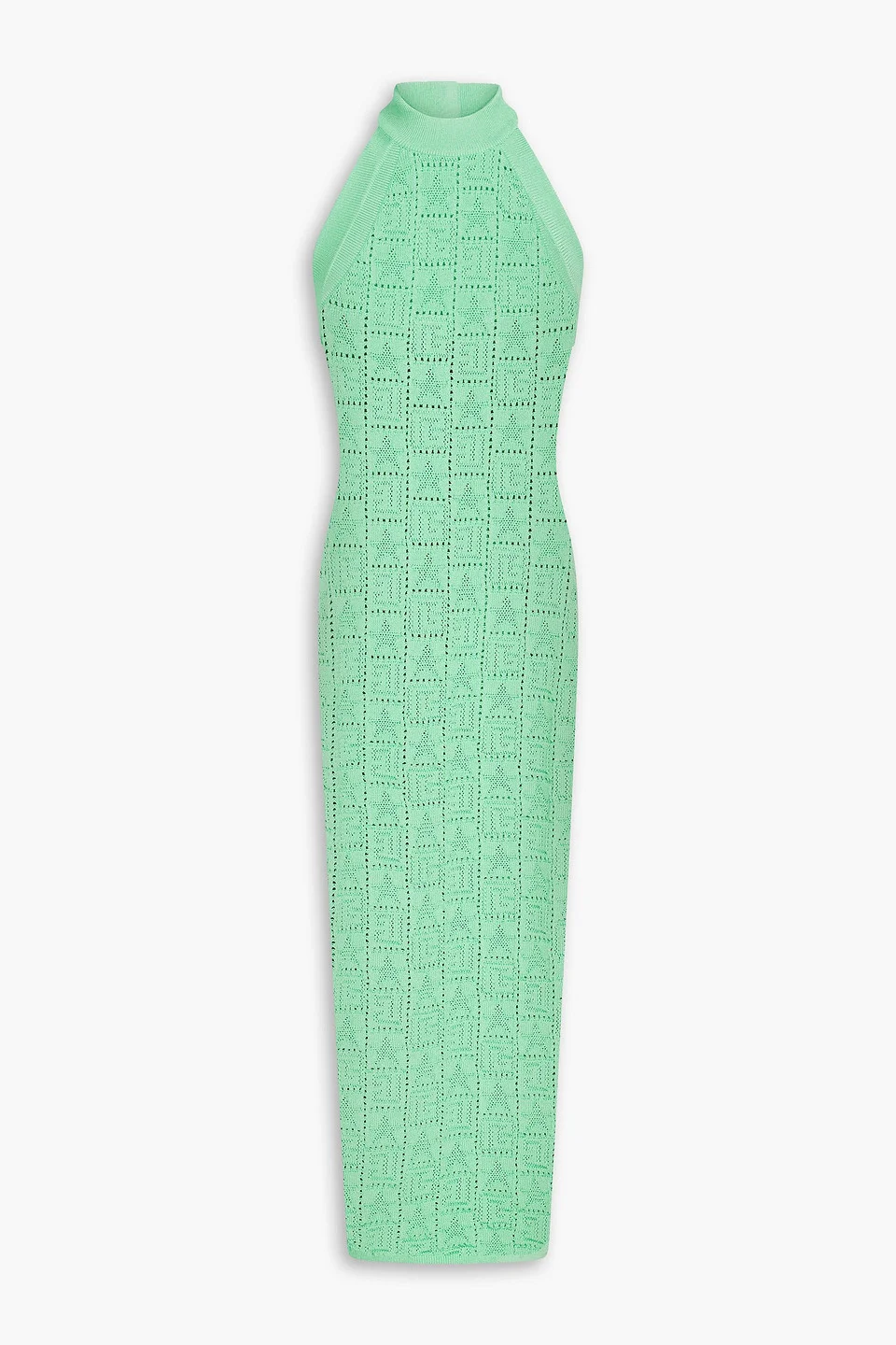 Dress crochet-knit ribbed trims open back snap fastenings at neck mid-weight knit dry clean made in italy Have a mint moment with Balmain’s halterneck midi dress. Made from a soft crochet-knit with ribbed trims and an open back, it’s perfect for making a statement. Wear it with heels and a clutch for your next dinner party. 84% Viscose 16% Polyester Product Code 1647597323486516
