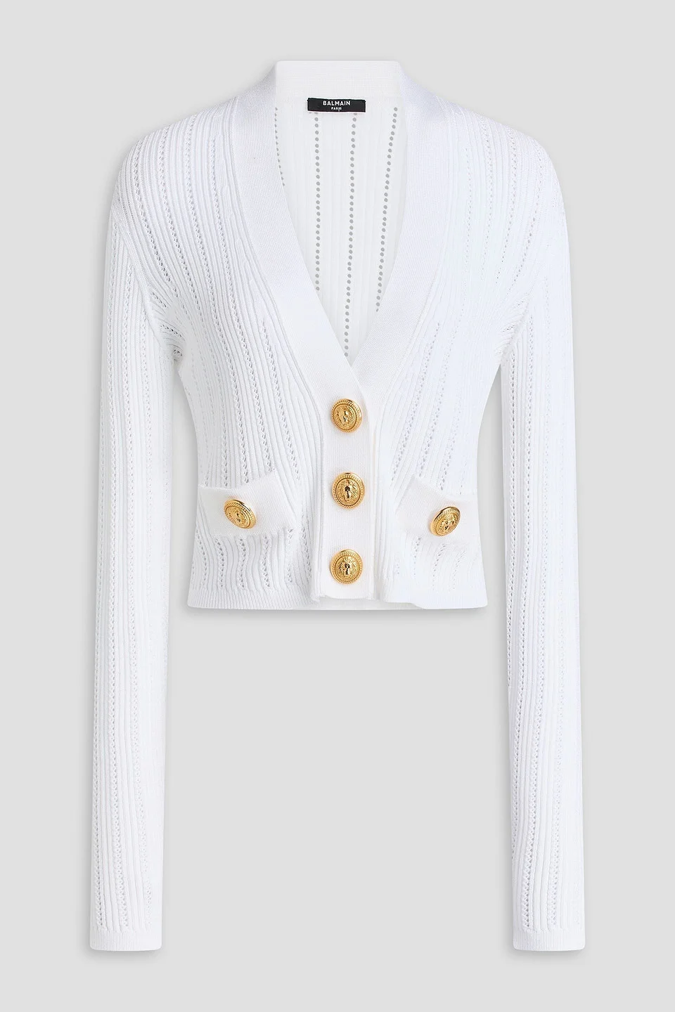 Cropped button-embellished ribbed pointelle-knit cardigan