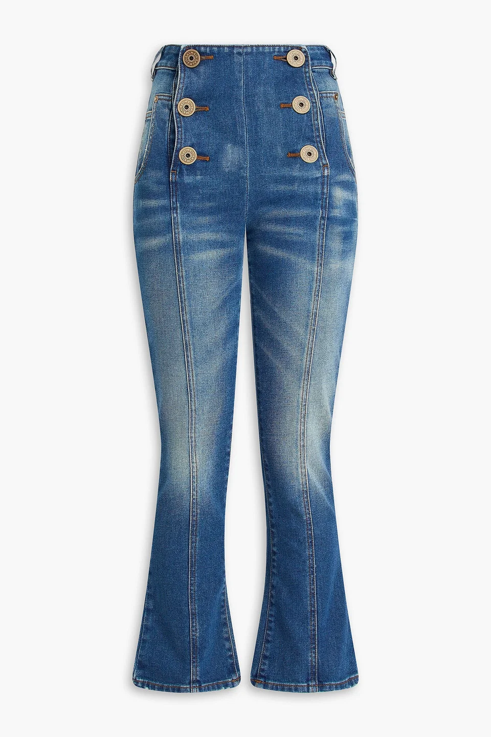 Bootcut jeans faded denim cropped distressed trims belt loops high-rise cut button fastenings along front mid-weight, slightly stretchy fabric machine wash made in italy 98% Cotton 2% Elastane Product Code 46376663162994545