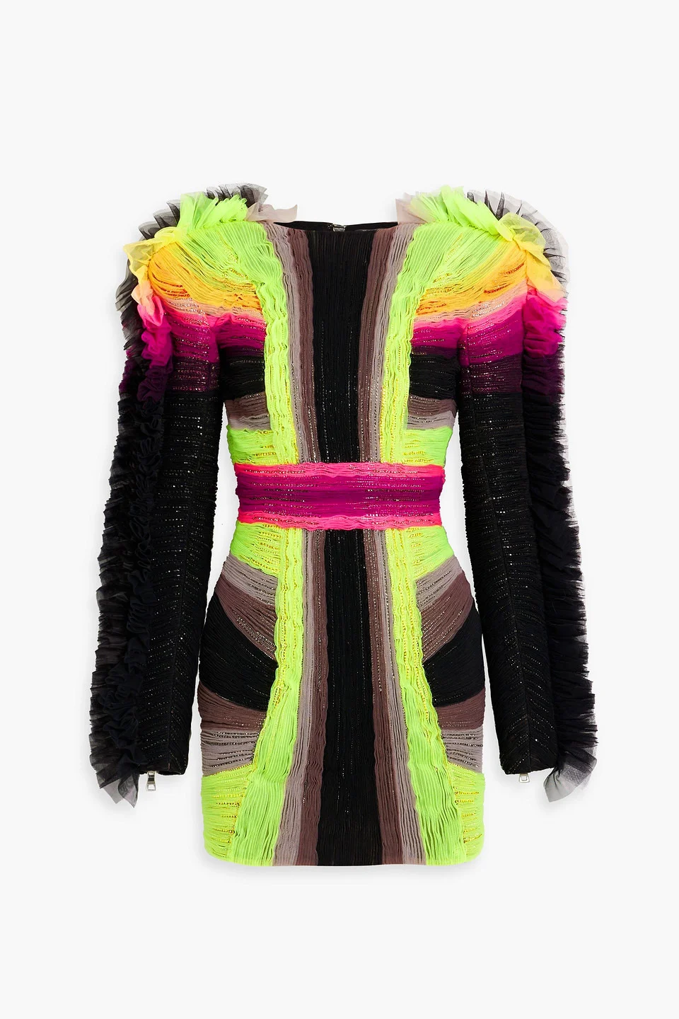 Dress striped tulle plisse crystals ruffled trims zipped cuffs fully lined zip fastening along back slightly stretchy fabric mid-weight fabric specialist clean imported 100% Polyamide Product Code 1647597319175300