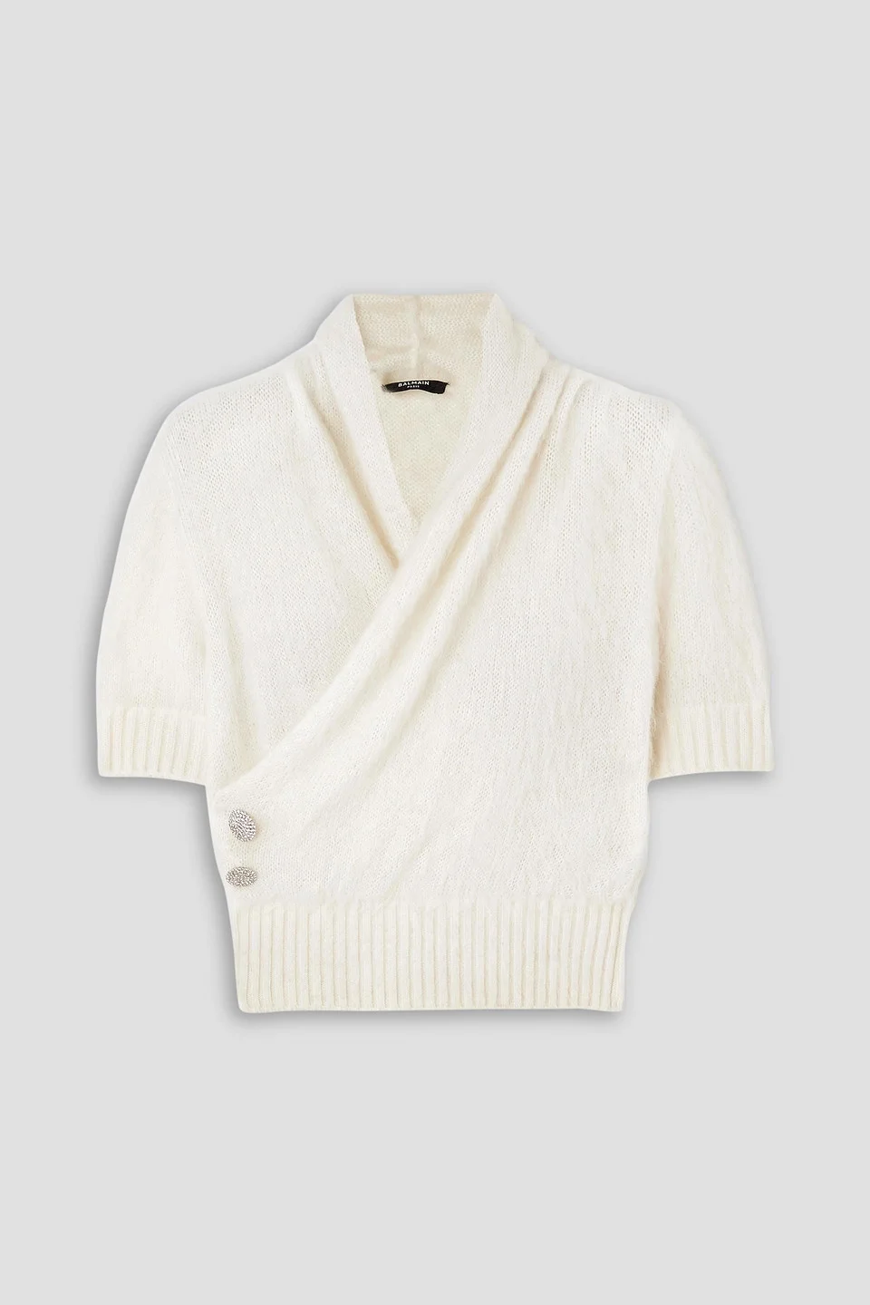 Sweater mohair-blend crystal buttons draped wrap-effect cropped ribbed trims slips on mid-weight knit dry clean made in italy Balmain's sweater is made from a mohair-blend that's lightly brushed to enhance its luxuriously soft handle. It has a draped, wrap-effect design punctuated with two crystal-encrusted buttons at the side and is complete with ribbed trims. 51% Mohair wool 24% Virgin Wool 21% Polyamide 4% Wool Product Code 1647597315272482
