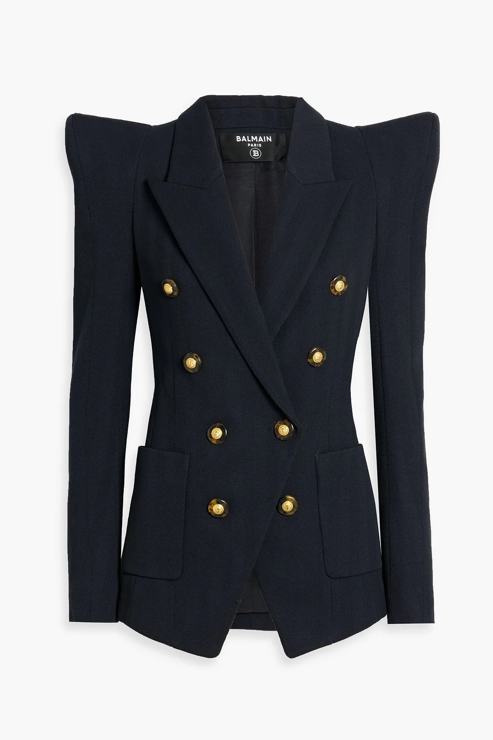 Blazer herringbone wool-twill button-embellished exaggerated shoulder pads buttoned cuffs front patch pockets button fastening at front fully lined mid-weight, non-stretchy fabric dry clean imported 100% Virgin Wool Product Code 46376663163073969
