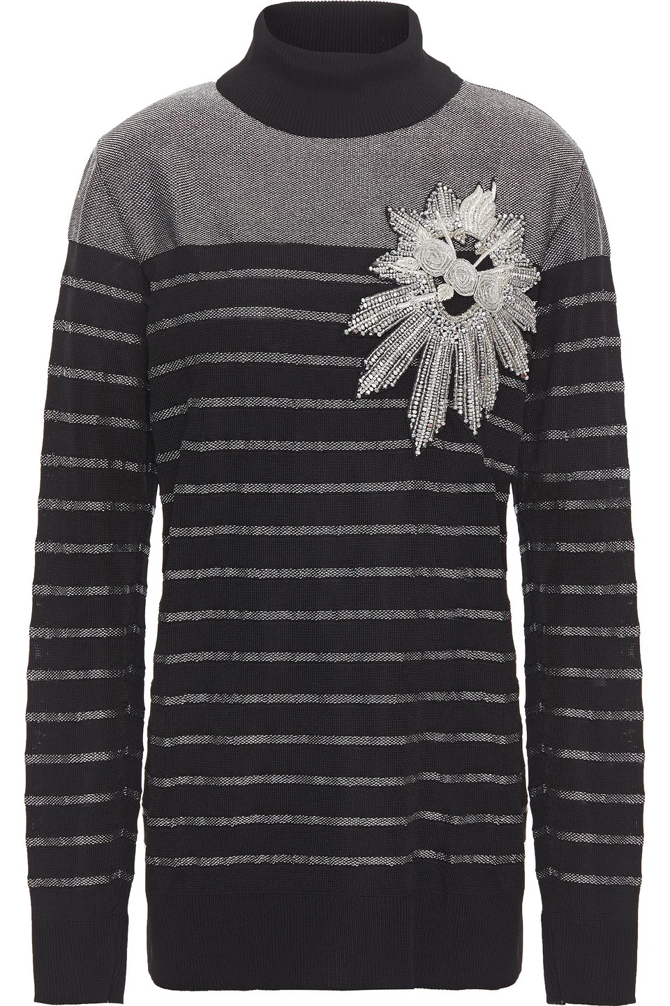 Turtleneck top metallic striped stretch-knit appliqued beads slips on mid-weight knit dry clean made in france 91% Viscose 5% Metal 3% Cotton 1% Polyester Product Code 23471478576489606