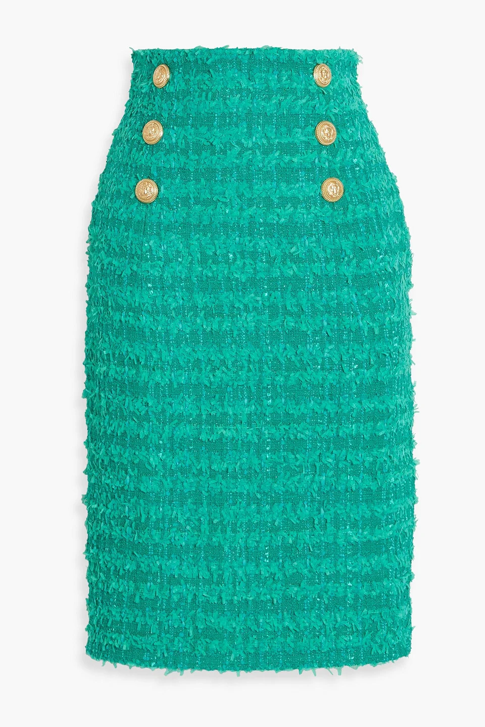 Skirt tweed cotton-blend frayed button-embellished fully lined two-way zip fastening through back mid-weight, non-stretchy fabric dry clean imported 50% Cotton 49% Polyamide 1% Metallic fiber Product Code 46376663162920764