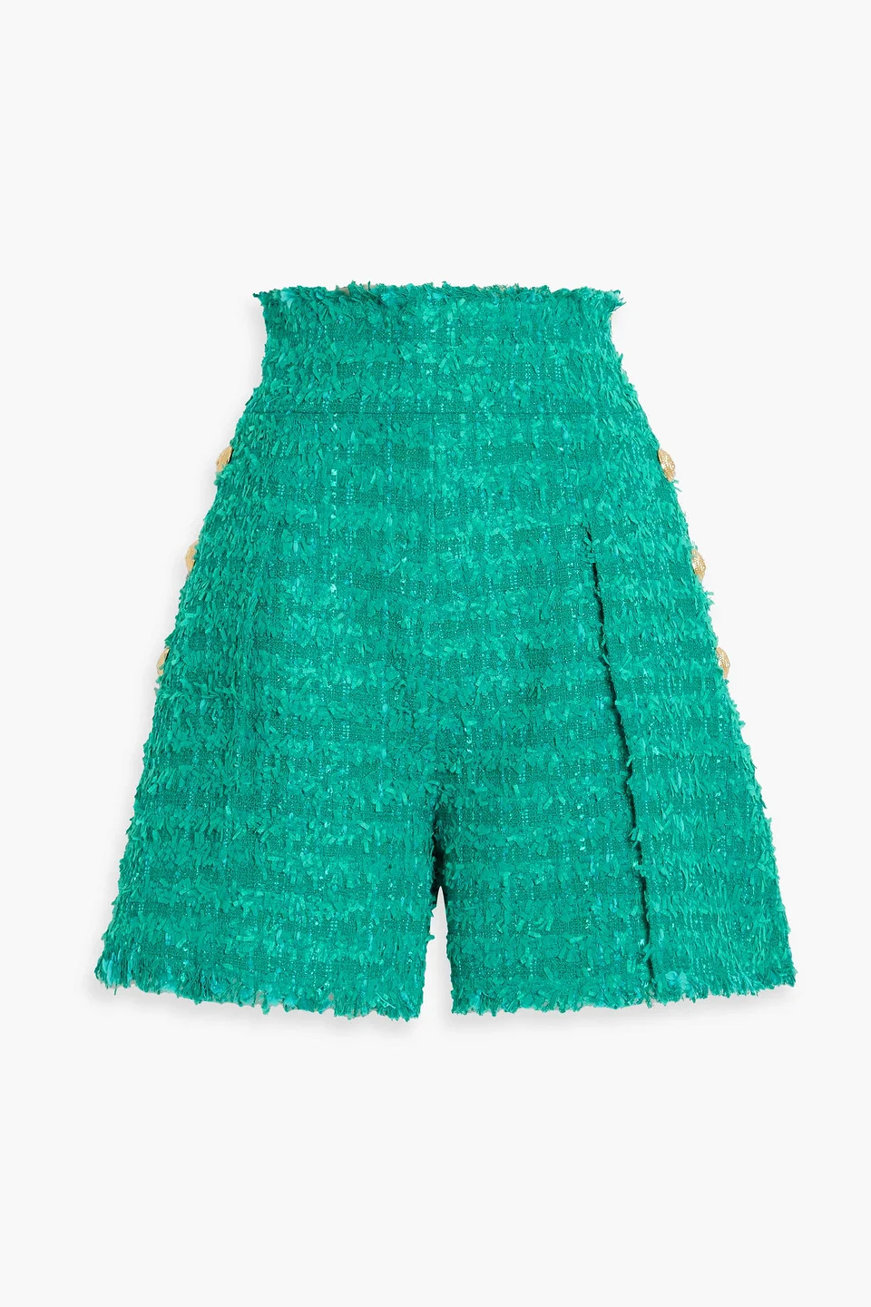 Shorts cotton-blend tweed frayed button-embellished pleated high-rise cut zip fastening along back mid-weight, non-stretchy fabric dry clean imported 50% Cotton 49% Polyamide 1% Polyester Product Code 46376663162920549