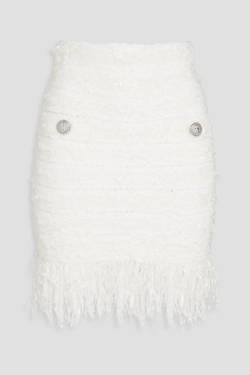 Skirt metallic boucle-knit button-embellished faux pockets fringed hem zip fastening along back mid-weight knit dry clean made in france Cozy and chic, Balmain’s mini skirt is full of personality. Made from soft boucle-knit, the wispy fringed trims are a playful touch. The metallic threads and button-embellishments add a little sparkle. 44% Textile fibers 34% Viscose 14% Acetate 5% Wool 3% Mohair wool Product Code 1647597357006560