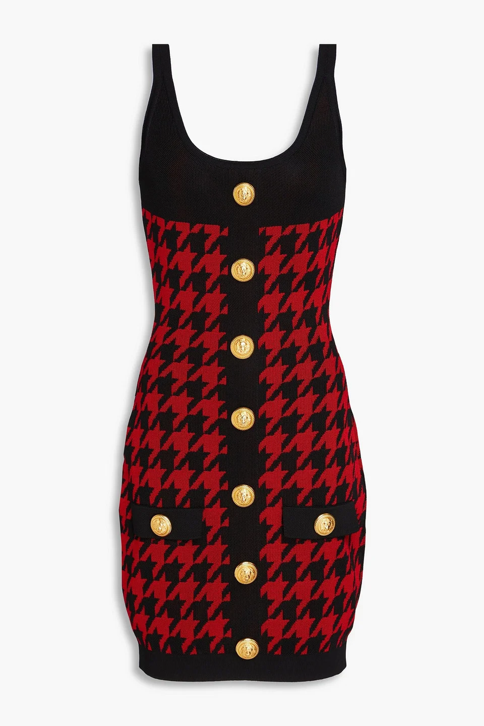 Dress houndstooth jacquard-knit button-embellished faux pockets zip fastening along back mid-weight knit dry clean made in france Balmain’s mini dress is a little preppy with a whole lot of attitude. Made from a cozy jacquard-knit, it features a bold houndstooth pattern and chic button embellishments. Wear it with heels and a clutch for your next dinner party. 100% Viscose Product Code 1647597359911849