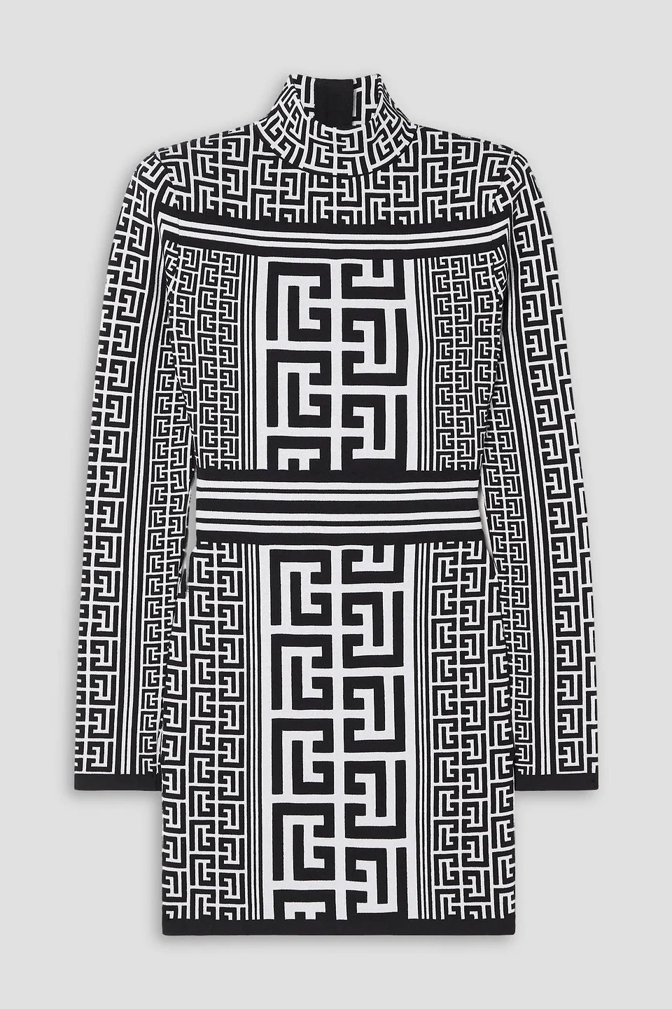 Dress jacquard-knit wool-blend exaggerated shoulder pads zip fastening along back mid-weight knit dry clean made in italy Balmain's 'PB' monogram is an ode to Pierre Balmain's fascination with the French labyrinths of the Renaissance era. It's jacquard-knitted into this wool-blend bodycon dress alongside stripes for a contouring effect. The mini hemline is balanced by a mock neck and the label's signature structured shoulders. 51% Wool 28% Viscose 19% Polyamide 2% Elastane Product Code 1647597306802486