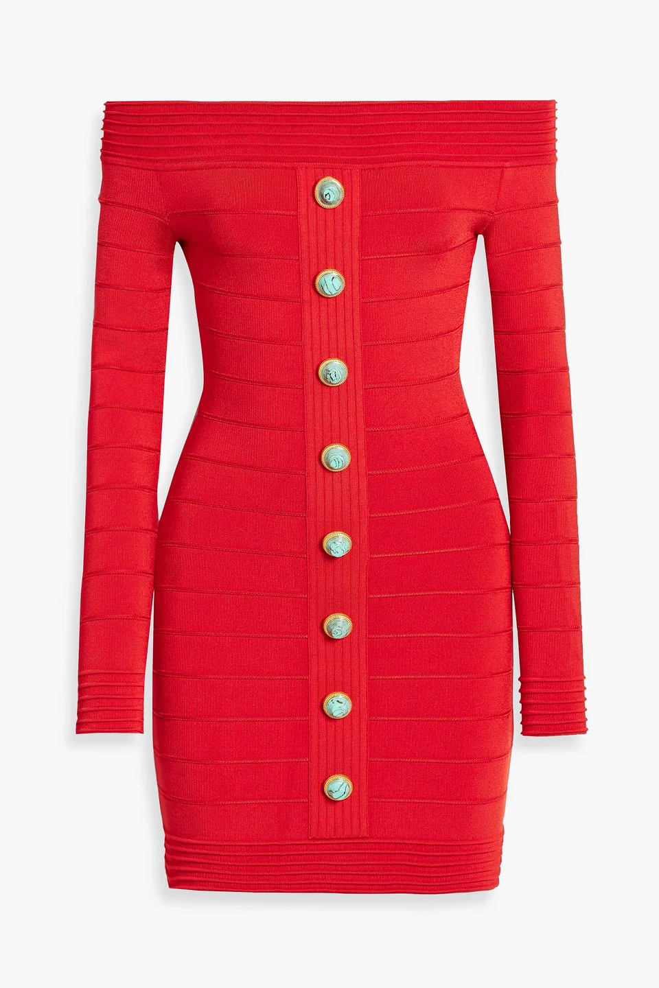 Off-the-shoulder dress stretch-knit button-embellished zip fastening along back mid-weight knit dry clean made in france Balmain's fiery red mini dress is an attention grabber. Made from figure-flattering stretch-knit, the off-the-shoulder design highlights your decolletage. The gold-tone button embellishments along the front add a bit of glam. Wear it with strappy heels for a night out or drinks with the girls. 89% Viscose 10% Polyamide 1% Elastane Product Code 46376663162920284