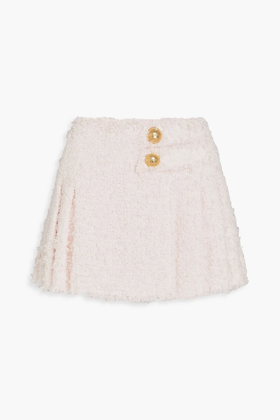 Skirt boucle-tweed pleated frayed trims buttoned waist tabs mid-weight, non-stretchy fabric dry clean imported Balmain's boucle-tweed mini skirt is coded with the maison's signature gold-tone buttons, and a flirty pleated hem. We love the fresh pastel pink shade, especially on sunny days, with a tonal top and heels. 100% Polyamide Product Code 1647597357008552