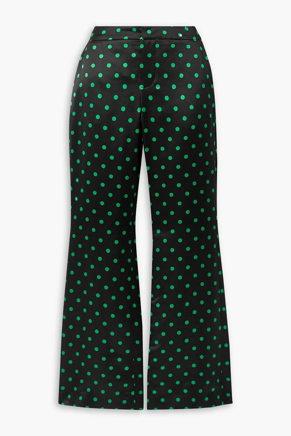 Flared pants polka-dot duchesse-satin side slant pockets back welt pockets mid-rise cut concealed hook, button and zip fastening at front mid-weight, non-stretchy fabric dry clean imported Love fashion trivia? Balmain's pants are printed with vibrant green polka-dots, one of founder Pierre Balmain's favorite patterns. Cut from glossy duchesse-satin, they have a mid-rise waist and flared legs. Style yours with a tucked-in tank and mules. 68% Viscose 32% Silk Product Code 1647597333165773