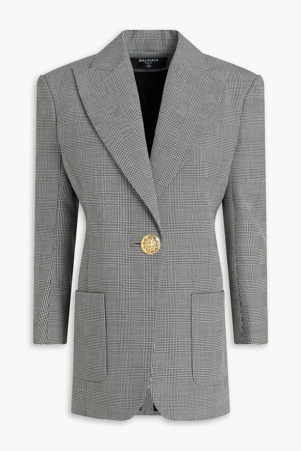 Blazer prince of wales checked wool shoulder pads buttoned cuffs front patch pockets button fastening at front fully lined back vent mid-weight, non-stretchy fabric dry clean imported 100% Virgin Wool Product Code 46376663162994742