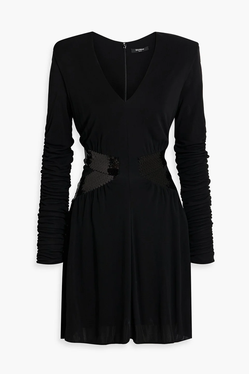 Dress jersey sequins ruched sleeves concealed hook and zip fastening at back fully lined mid-weight, slightly stretchy fabric dry clean made in france 100% Viscose Product Code 46376663162929057