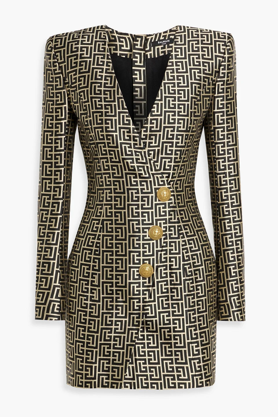 Dress jacquard button-embellished wrap-effect shoulder pads buttoned cuffs zip fastening along back fully lined mid-weight, non-stretchy fabric dry clean made in italy 88% Acetate 12% Silk Product Code 46376663163073979