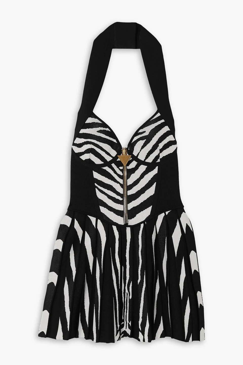 Dress jacquard-knit studded halterneck zip fastening along front snap fastenings at neck mid-weight knit hand wash or dry clean made in france Balmain's mini dress is jacquard-knitted with bold zebra stripes throughout the fitted bodice and sweet, pleated skirt. The bust is adorned with a zipper embellishment that matches the gold-tone buttons securing the wide, halterneck straps. Style yours with leather accessories. 85% Viscose 12% Polyester 3% Polyamide Product Code 1647597288487258
