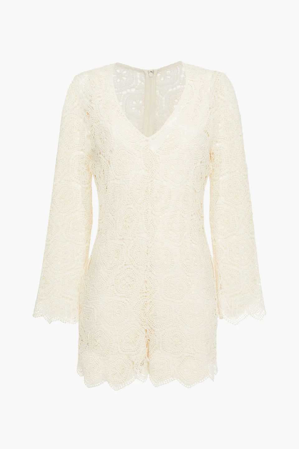 Playsuit crochet cotton-blend bell sleeves concealed hook and zip fastening at back partially lined stretchy fabric mid-weight fabric machine wash or dry clean imported 85% Cotton 15% Polyester Product Code 11452292645371986