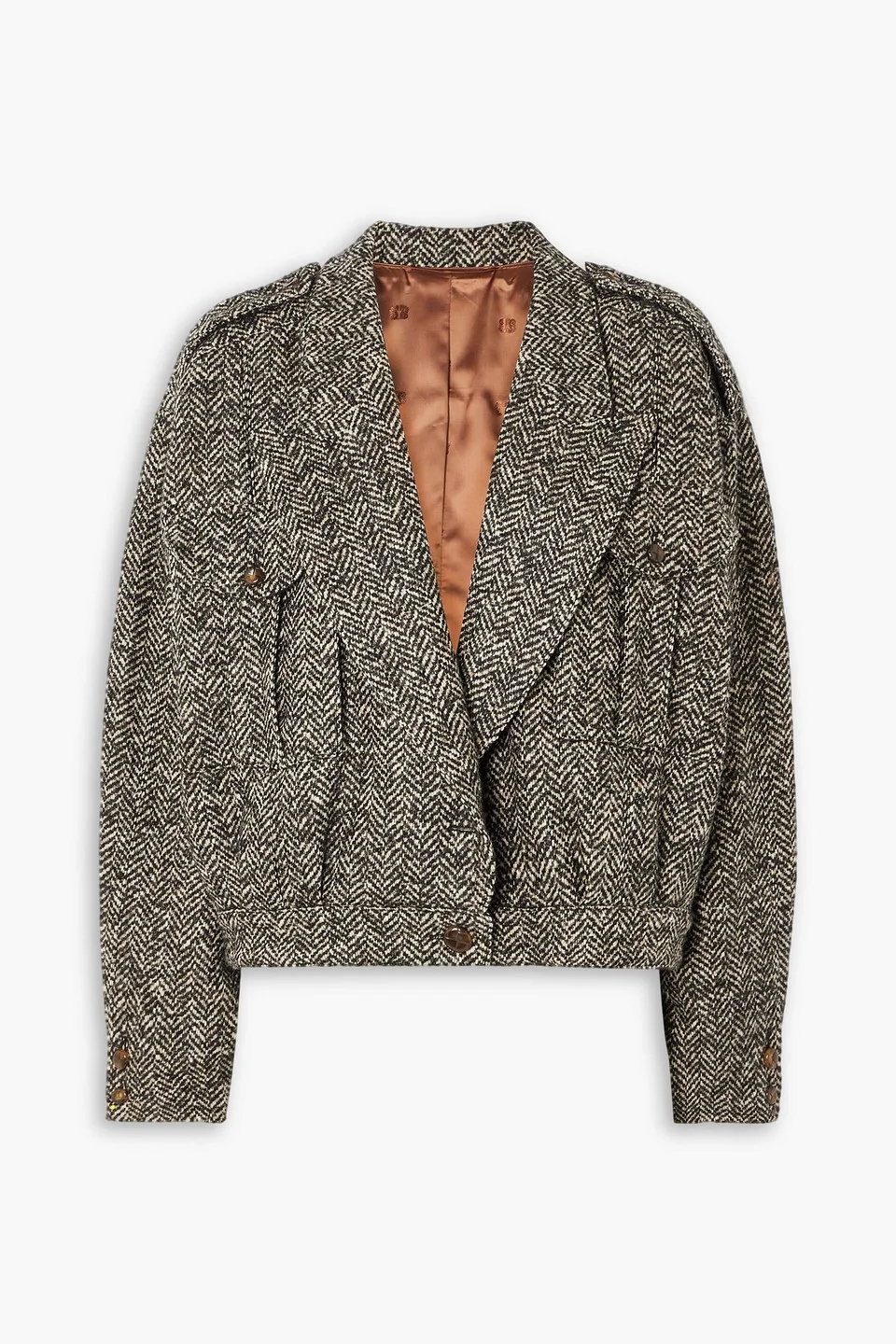 Jacket herringbone wool-blend buttoned tabs buttoned cuffs front flap pockets internal pocket button fastening at front fully lined mid-weight, non-stretchy fabric dry clean made in italy 84% Virgin Wool 6% Alpaca wool 6% Mohair wool 4% Polyamide Product Code 46376663163069953