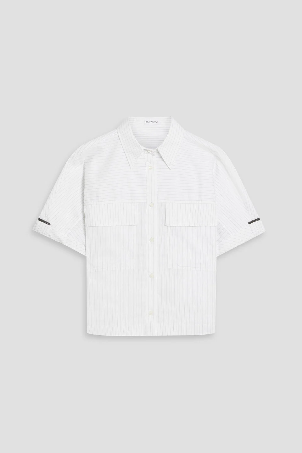 Bead-embellished cropped pinstriped cotton and silk-blend shirt