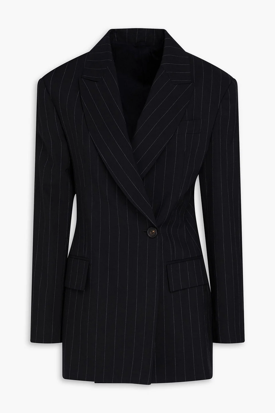 Bead-embellished double-breasted pinstriped wool and cotton-blend blazer