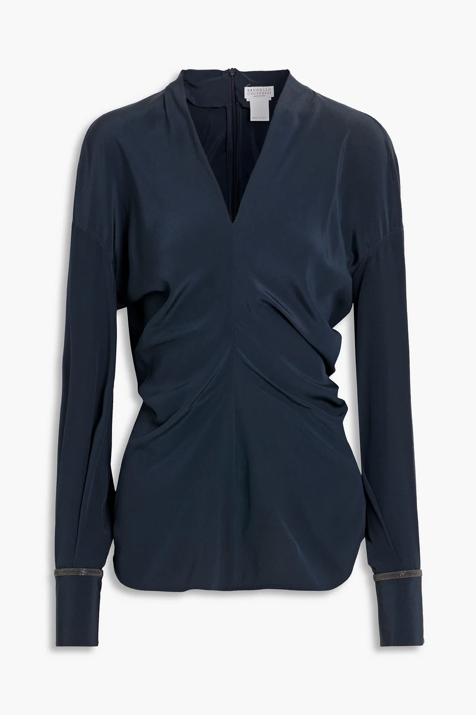 Blouse silk bead embellishment draped buttoned cuffs concealed zip fastening along back mid-weight, non-stretchy fabric dry clean made in italy 100% Silk Product Code 46376663163113125