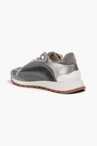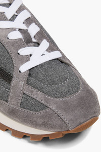 Sneakers suede wool bead embellishment metallic leather trims round toe lace-up front fully lined rubber sole made in italy Step into style with Brunello Cucinelli’s chic sneakers. Made from suede, wool, and metallic leather, they feature the label's signature bead embellishments. Wear them with your favorite denim or a casual dress for effortless flair. 100% Virgin Wool 0% Calf-skin leather Product Code 46376663162938430