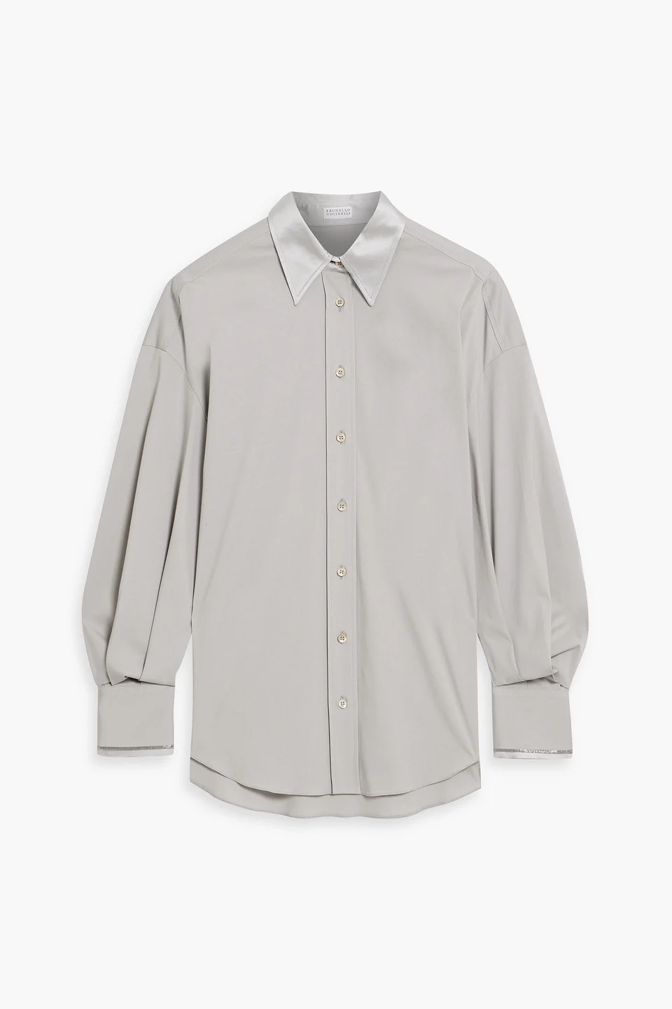 Shirt poplin stretch cotton-blend bead embellishment pleated back buttoned cuffs curved hem button fastenings through front mid-weight, stretchy fabric hand wash or dry clean made in italy Brunello Cucinelli's shirt is made from cotton-blend poplin with the label's signature bead embellishments. Wear it to elevate your office look or for chic weekend gatherings, and watch the compliments roll in. 72% Cotton 23% Polyamide 5% Elastane Product Code 46376663162852920